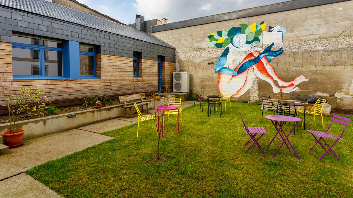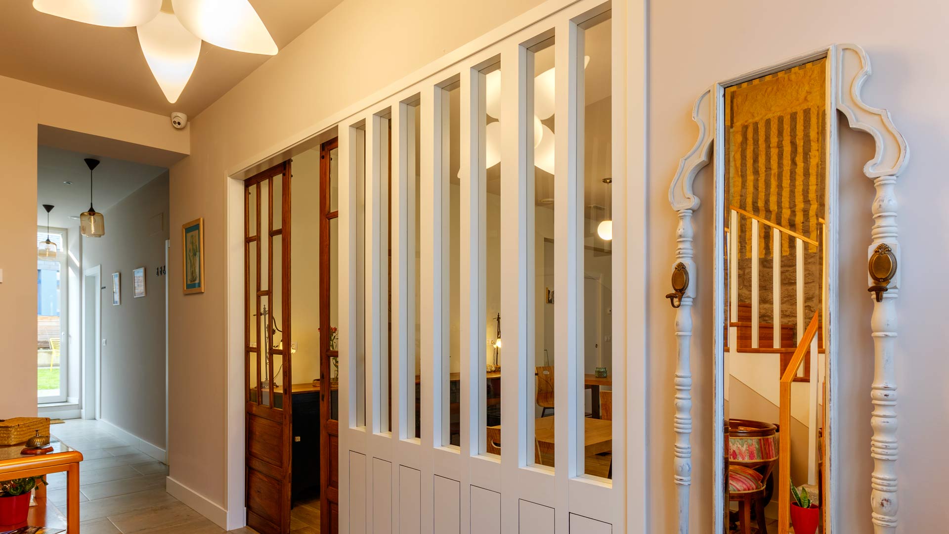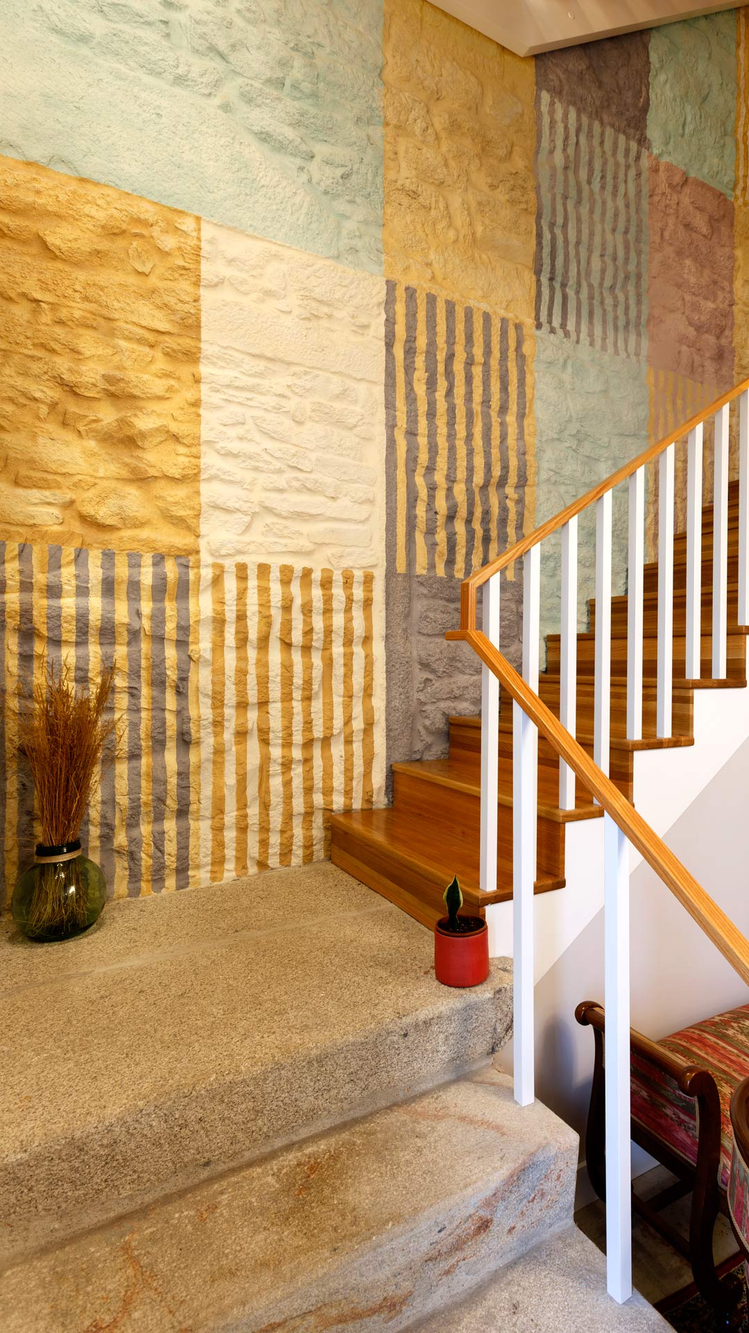 Tabiquería interior, ejecución de aislamientos, nuevas instalaciones de fontanería y electricidad, climatización y calefacción de todos los locales, acondicionamiento de patio exterior y sala multiusos, ejecución de una nueva escalera interior en madera, mural en lateral de escalera, etc.